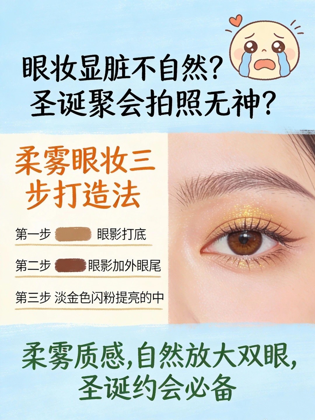 谁懂啊宝子们!圣诞约会不想撞款千篇一律的红绿色浓妆,又怕手残画不出精致感?😭 这套「柔雾碎钻圣诞妆」直接封神!低饱和色系超消肿,新手也能拿捏的轻欧美感,温柔又带点小俏皮,不管是约会还是聚会都能稳站C位~ 关键是步骤超简单,手残党闭眼冲!👇