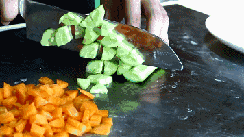 碰上黄瓜、节瓜这种圆滚滚的食材,本身在菜板上就放不住,用力的时候一摇晃,一不小心就会跑刃切到自己。