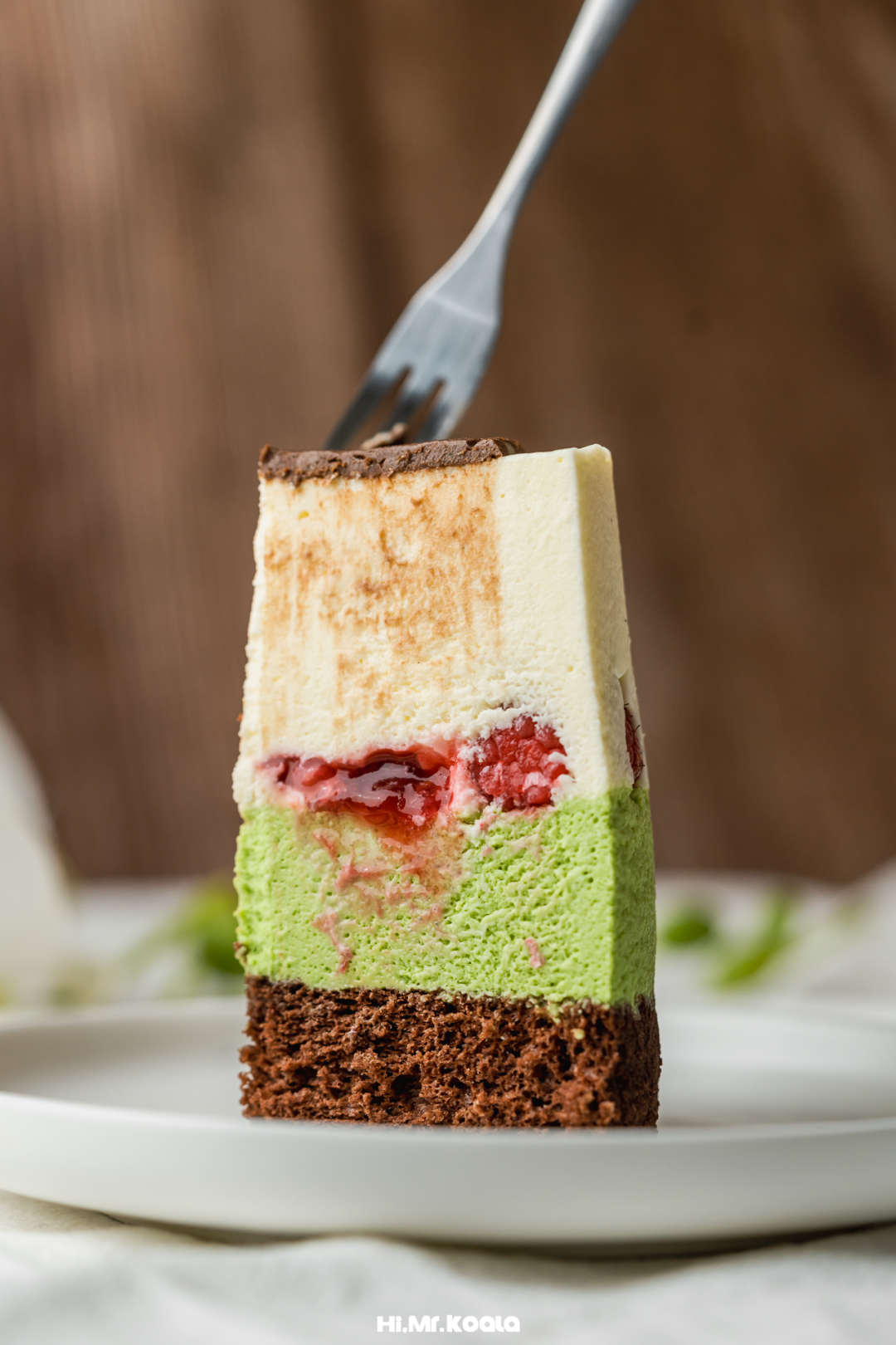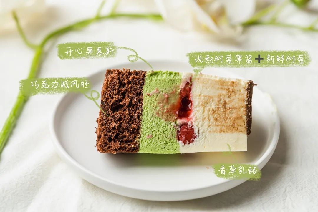 不是传统的奶油蛋糕,风味呈现也很直给,现熬树莓果酱与新鲜树莓的清新酸甜,刚好中和开心果与巧克力的浓醇,香草乳酪则添一抹奶香;既有慕斯的清爽、又兼顾布丁的嫩滑,口感在水灵、香醇、细腻中来回切换,甜度友好,挖一勺入口,分层轻盈地消融在口中,冰淇淋一般,太适合春天了。