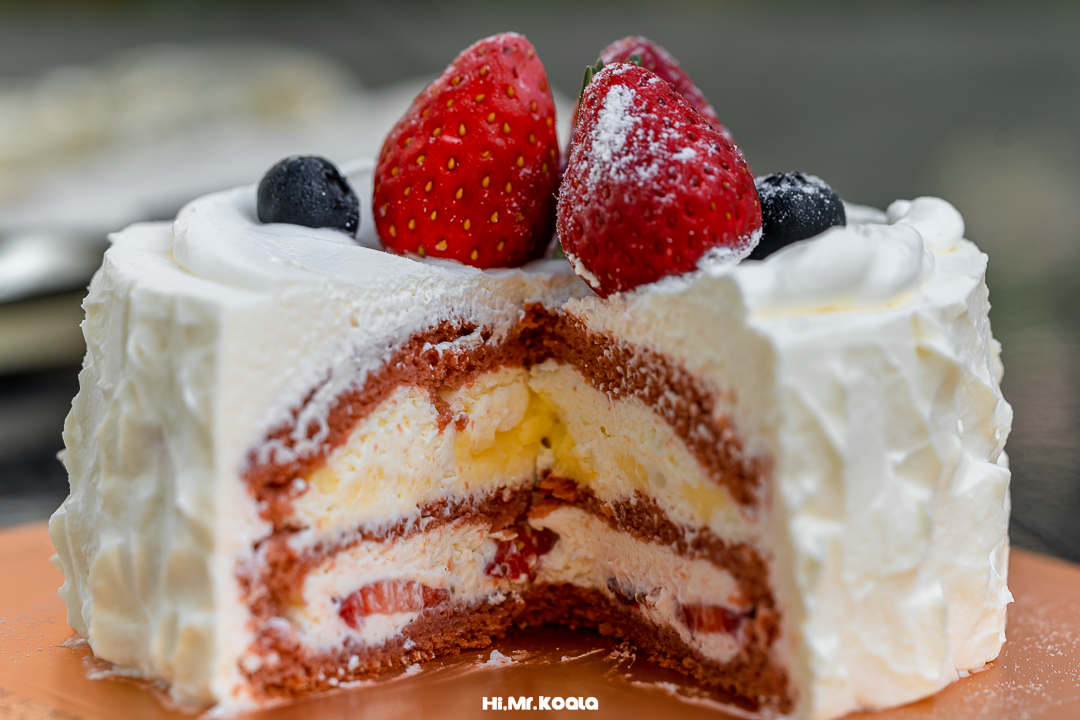 ◯ 夹心:新鲜草莓、山茶花奶油、斑斓戚风、莓果果酱