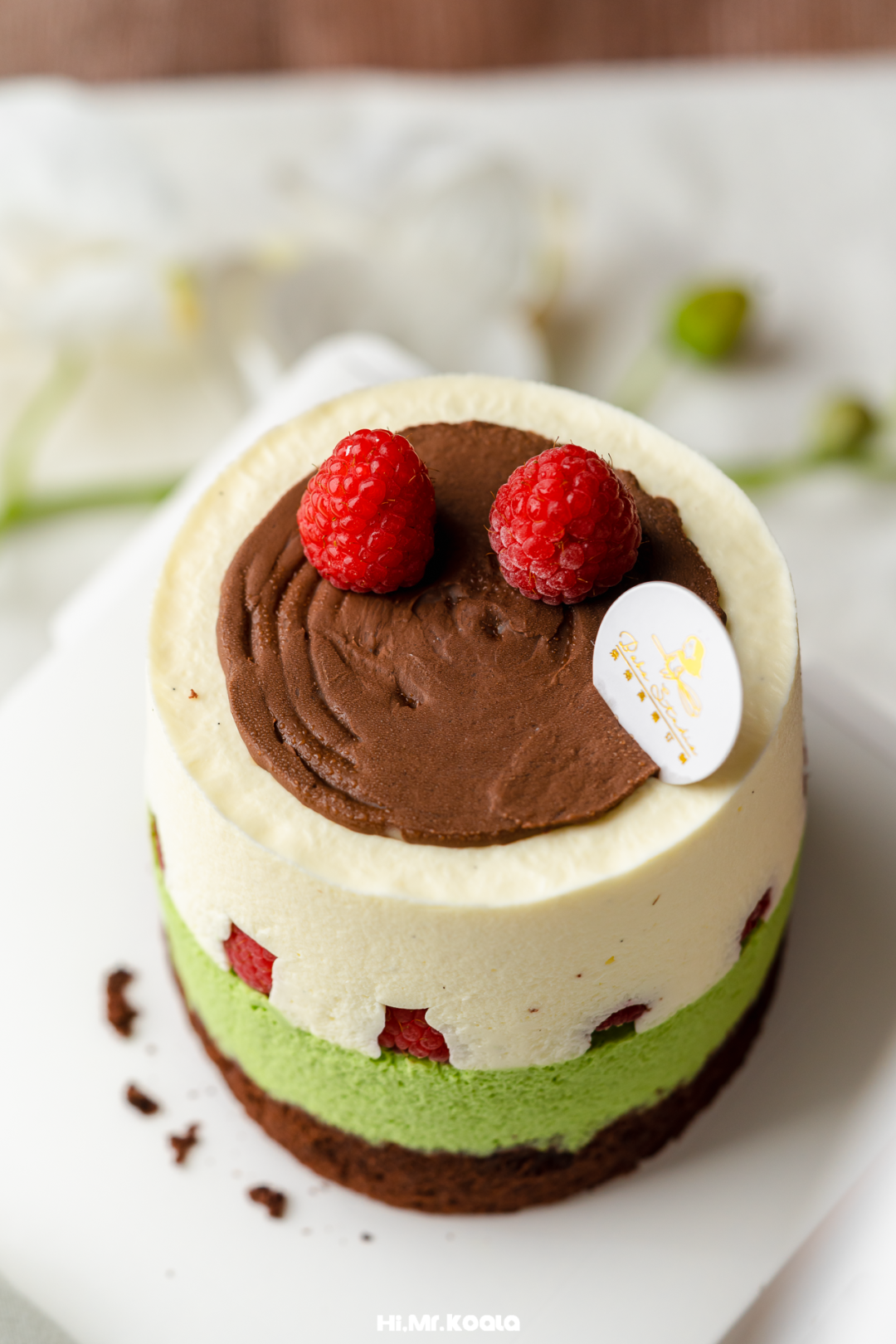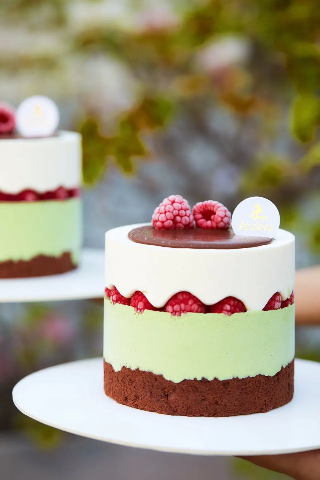 ◯ 甘纳许巧克力淋面、新鲜树莓、日本正荣开心果酱
