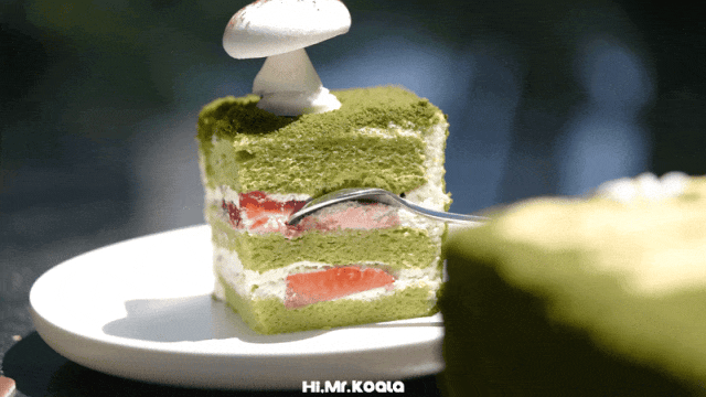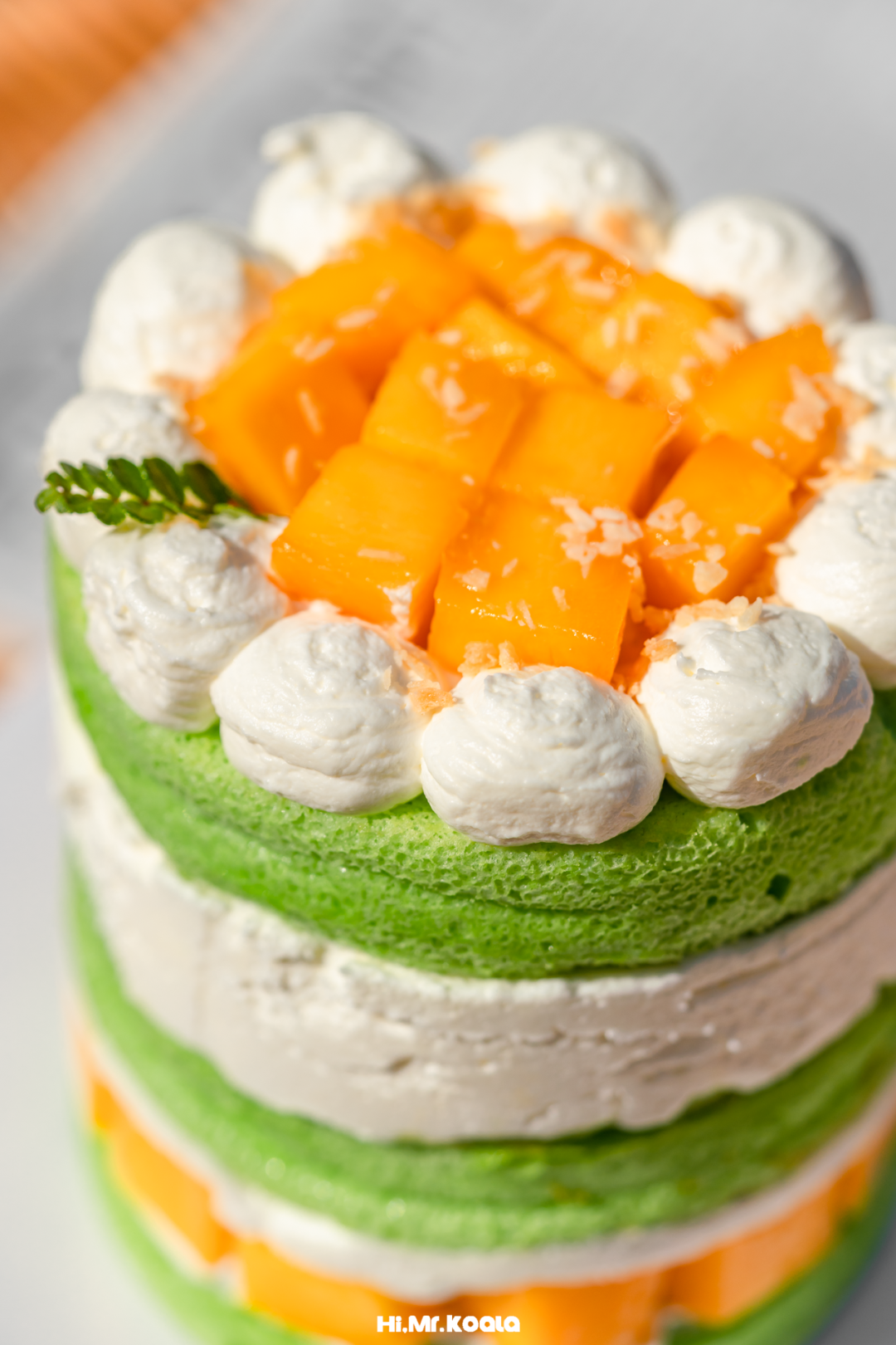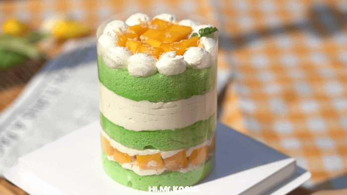 蛋糕胚中的绿色,来自天然斑斓,质地也很优秀,湿软弹润,每一个小气孔里都充盈着斑斓叶的特殊清香,像阳光、青草和浓郁的蒸糯米香气,拆开蛋糕就被勾出馋虫。自制低甜椰子奶冻,口感滑嫩带点儿韧,大力挖一勺,椰子奶油裹满大颗芒果果肉,一口吞下,是充满南国风情的甜美,特别降低用糖力度,甜度友好。