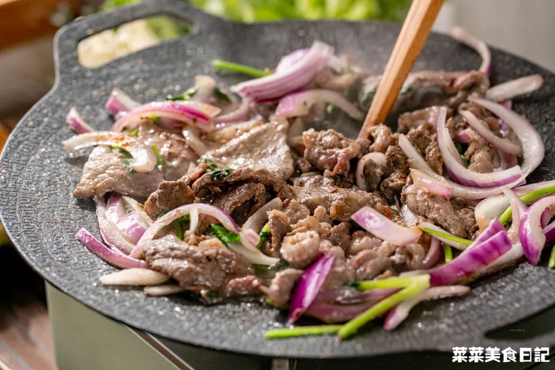 5.烤肉盘烧热,用牛油涂抹均匀锅,煎出薄薄一层油脂,倒入腌制好的牛肉,平铺一层,烤1-2分钟变色后,再翻面烤一分钟