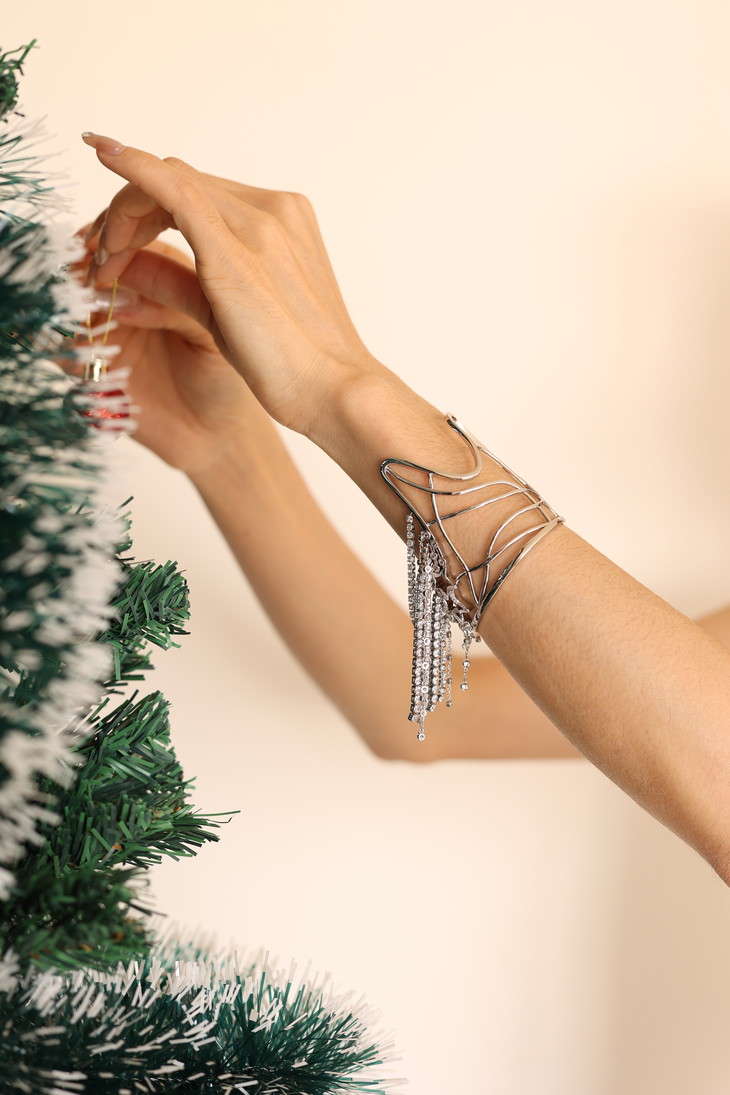首饰选择了RC Mordern Art 现代艺术系列的「星芒流苏耳环和手镯」作为搭配,简直是party吸睛神器❗