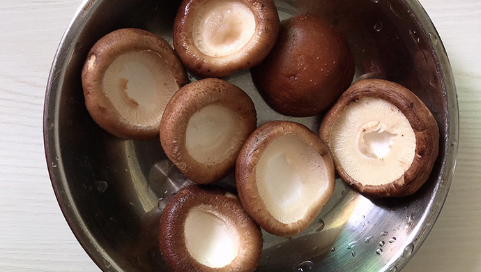 1、干香菇温水泡发,10分钟左右,等它完全舒展开,再用淘米水浸泡1个小时,用清水把香菇冲洗干净,攥干水分备用,沾上一层薄薄的干淀粉;