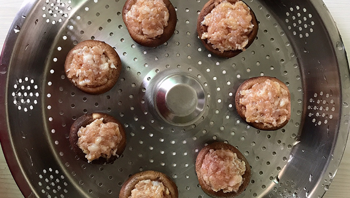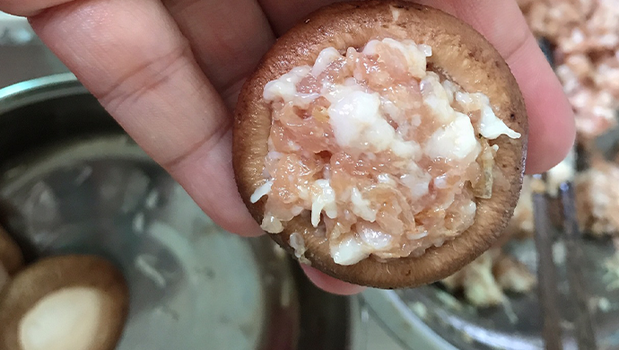 1、把肉馅均匀的涂在香菇里,防止酿的肉馅脱落,根据香菇数量,把肉馅均匀的分成等份,把肉馅酿入香菇中,轻轻挤压,粘实,上面可放香菜叶和枸杞点缀;