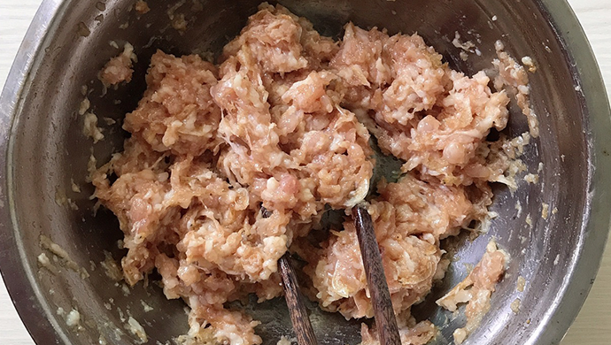 2、肉馅中放入半个鸡蛋液,2小捏盐,1勺生抽,1小捏十三香,搅拌均匀,刚才切下来的香菇棒切碎,山药丁准备1两,胡萝卜丁准备1两,都切成小丁,放入肉馅中拌匀,滴几滴香油;