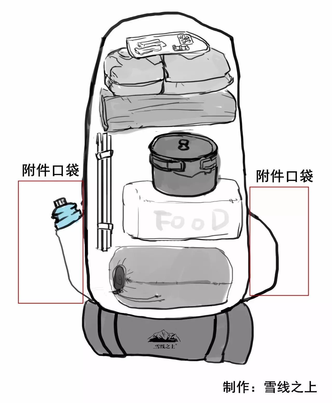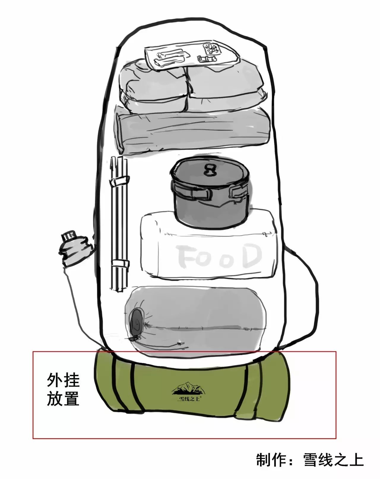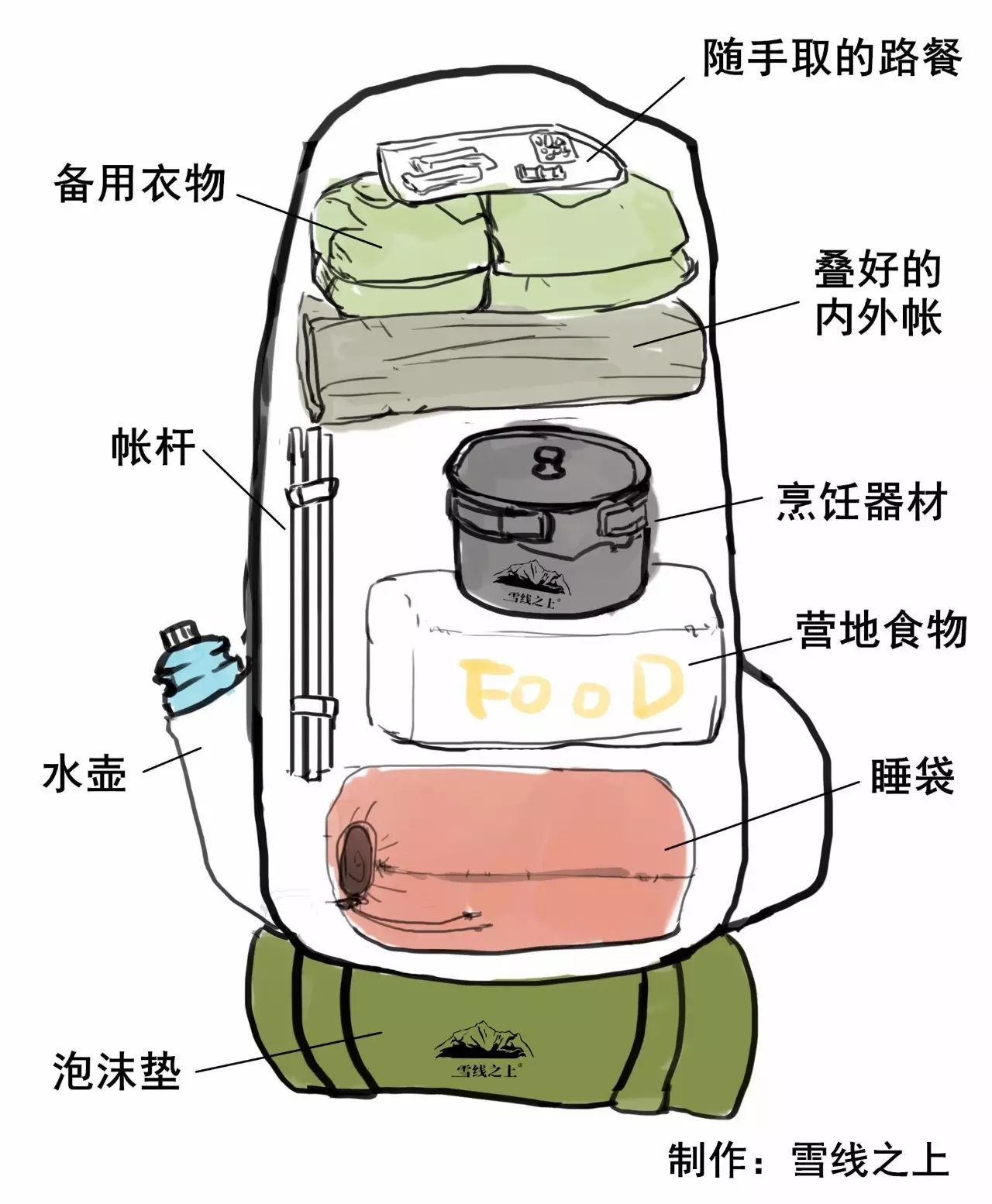 路餐,备用衣物等常用物品放在了背包最上方。到了营地才会用到的帐篷,烹饪器材,睡袋等就可以放在包的中下部。