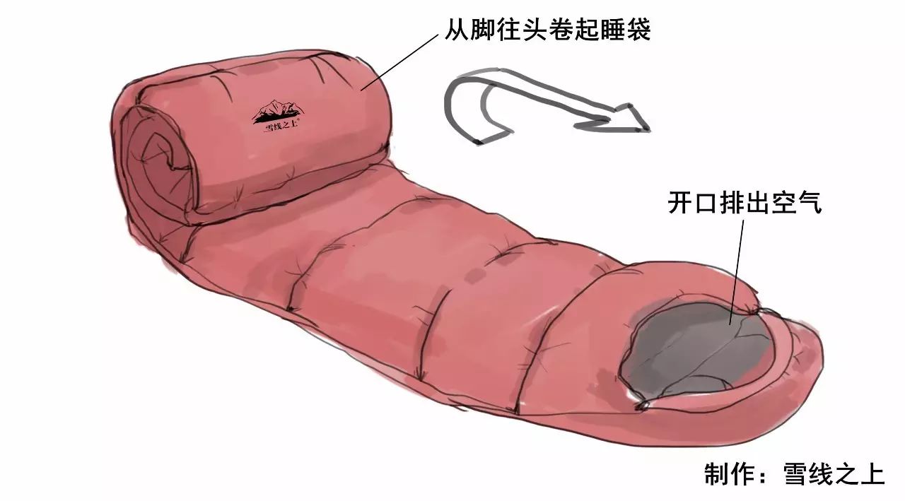 睡袋的收纳最重要的是排气,才能让睡袋体积尽可能小。