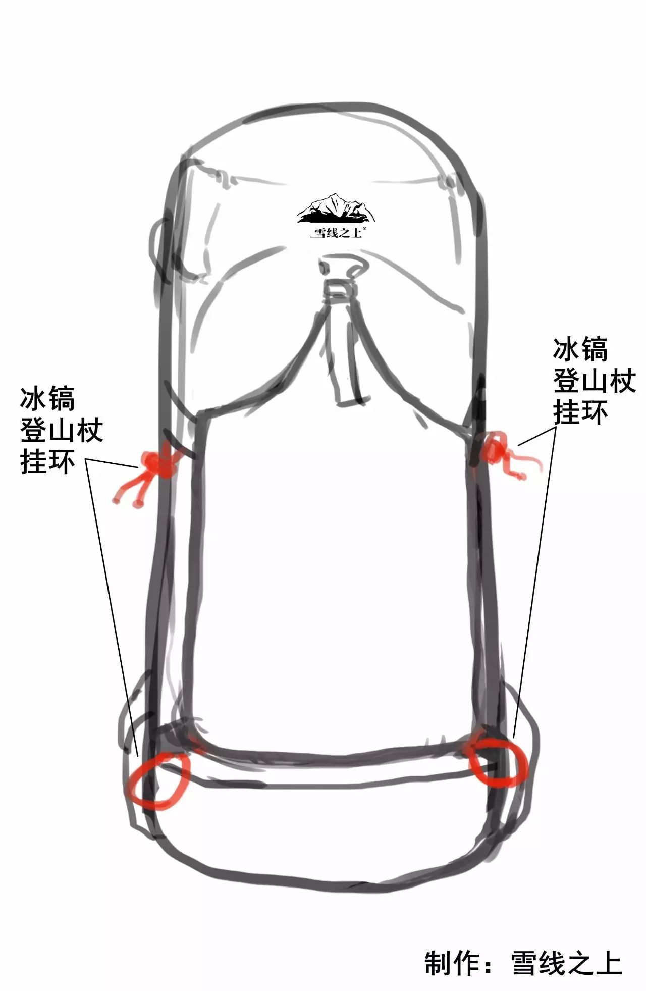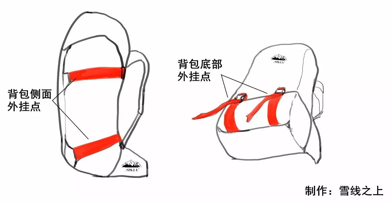 外挂物品依照背包设计进行分布,背包后背,侧面和底部都有外挂点。后背外挂点一般用于冰镐,登山杖的外挂;侧面和底部可以用于挂泡沫垫。