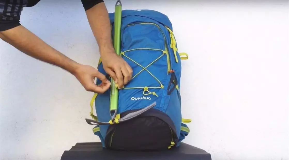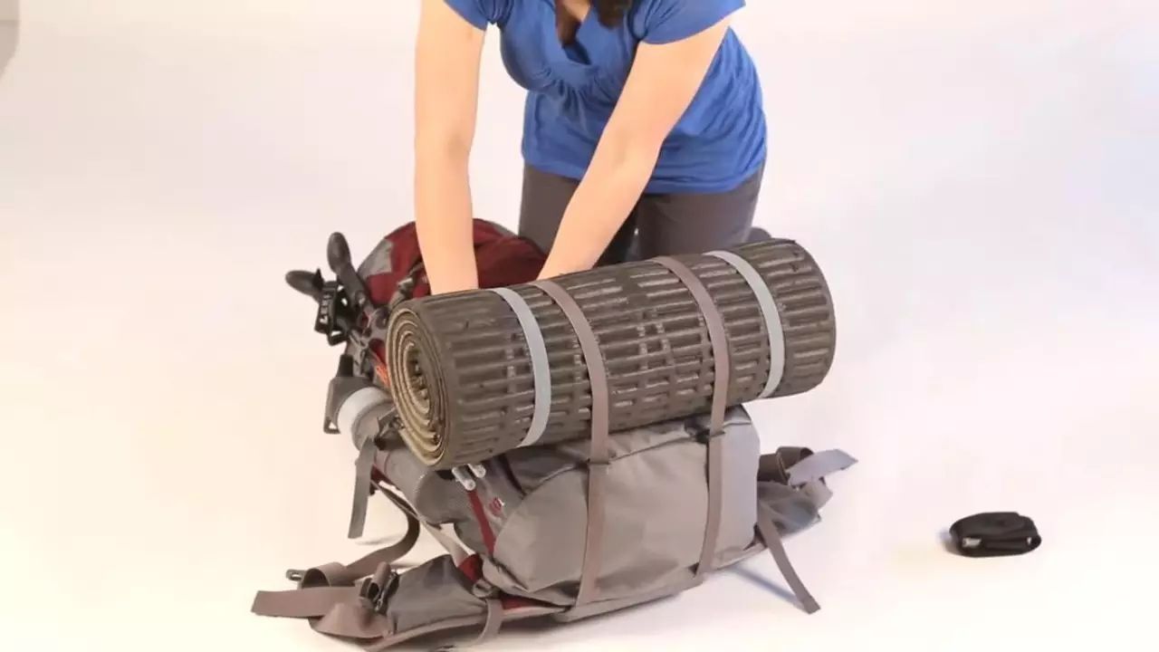 外挂携带泡沫垫。截图来自Eastern Mountain Sports发布的视频《How to Pack a Backpack:Eastern Mountain Sports》