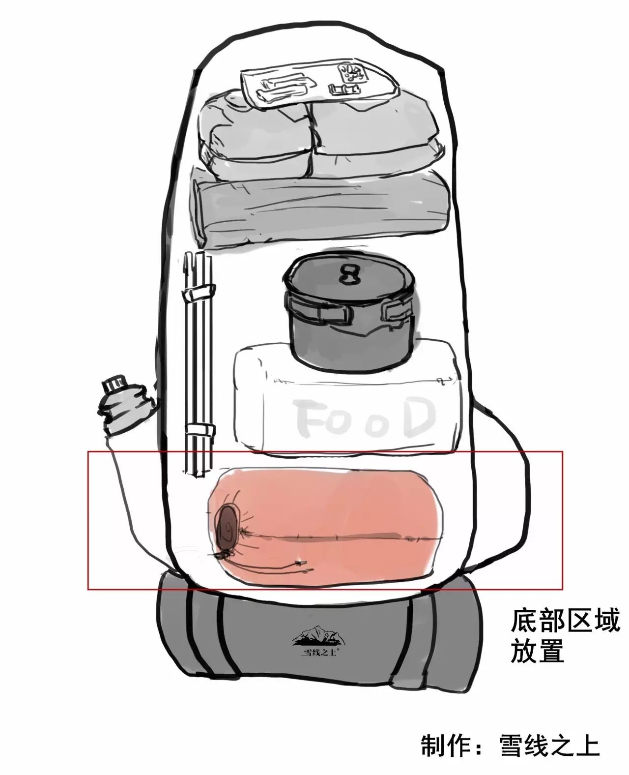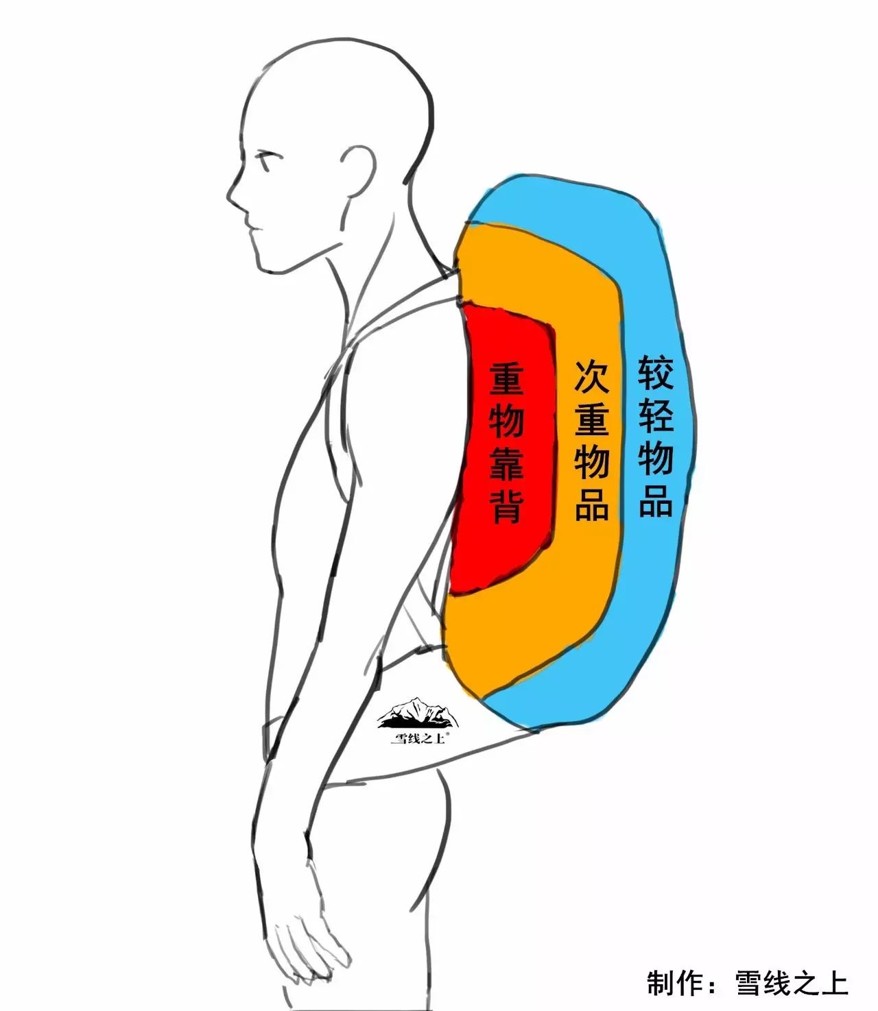 轻的羽绒服,睡袋等远离背部,同样是为了使重心提高,并在放包时能起到缓冲、保护的效果。