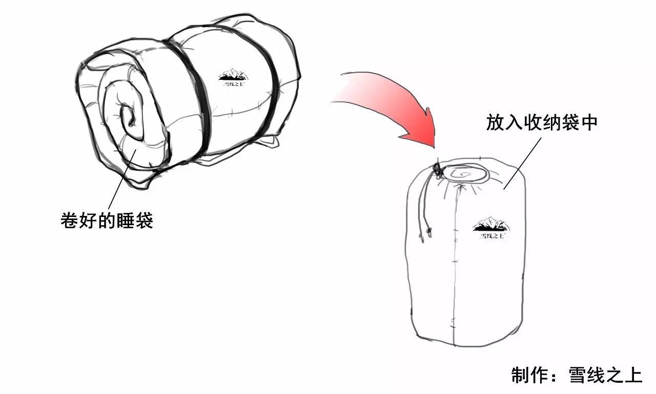 卷起后,通过伸缩束带压缩睡袋,塞入收纳袋或者防水压缩袋中。