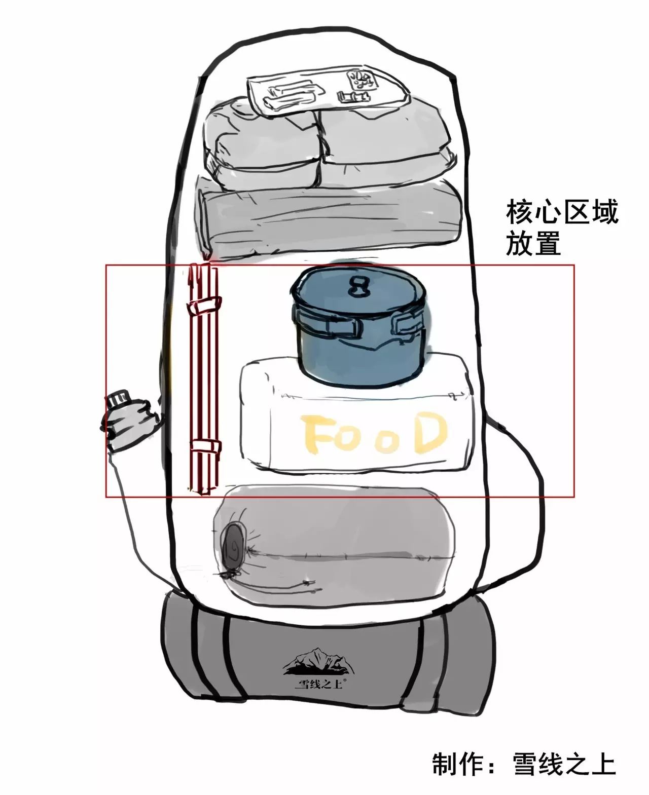 背包中心区域适合沉重的,在途中几乎不需要的物品。