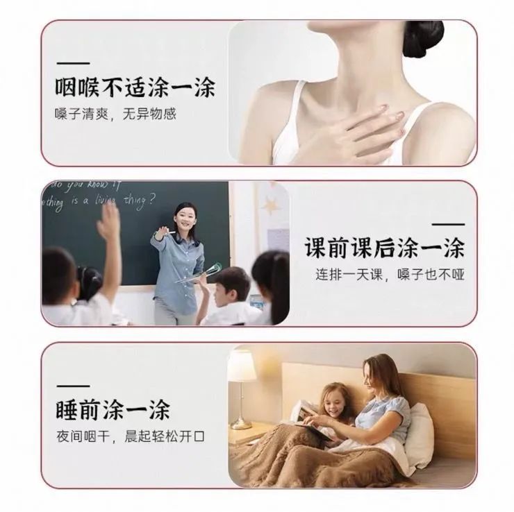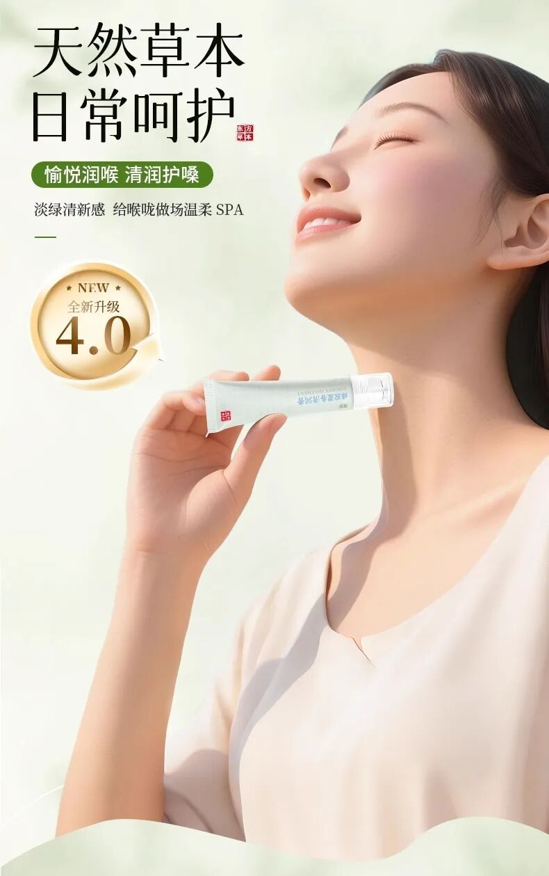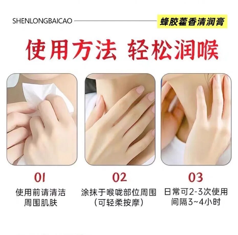 【使用方法】使用前清洁周围肌肤,取适量涂抹于喉部,建议每日使用两到三次