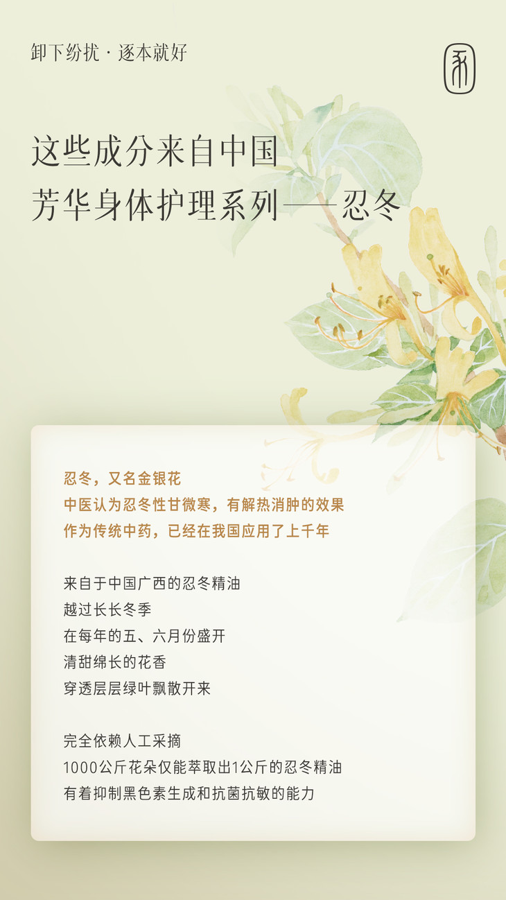 逐本以天然、诚实、疗愈、平衡为产品开发四大原则,以全球优质产地天然成分为基础,最小化肌肤与自然环境的代谢负担,最大化唤起素肌的健康之美。