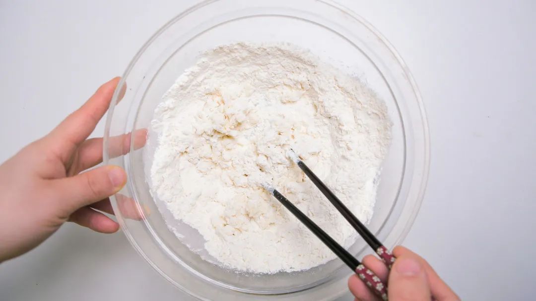 慢慢给面粉中倒入清水,分次加入,边倒边搅拌,直至搅拌成均匀的面絮