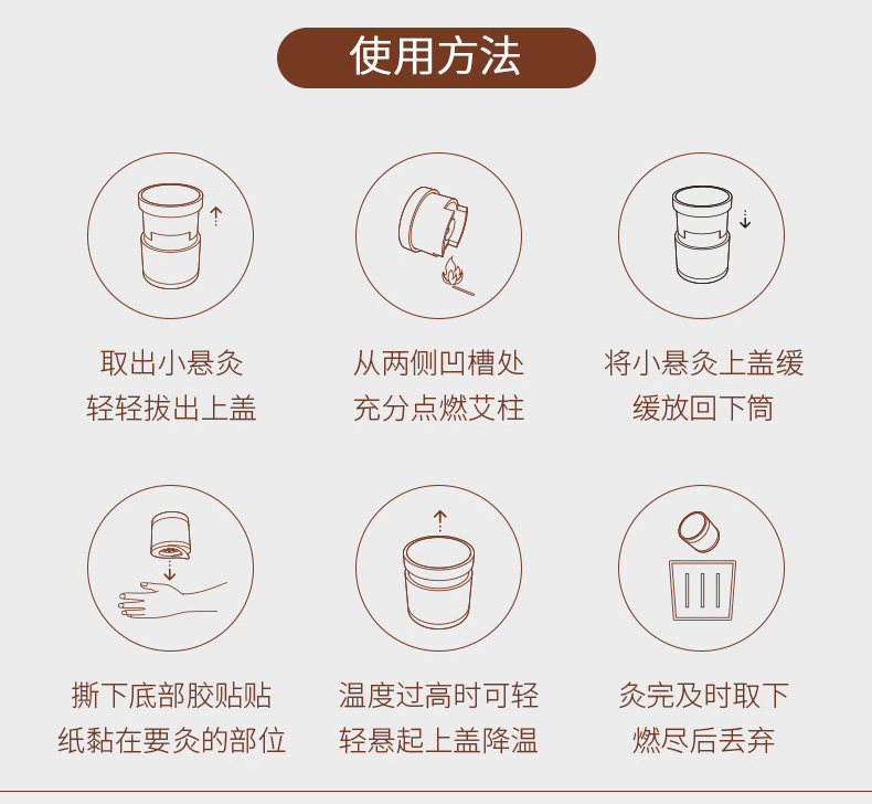 每个小悬灸底部有一圈双面胶贴,可以牢牢固定在皮肤上,随时享受舒适的热灸,不易刺激皮肤。