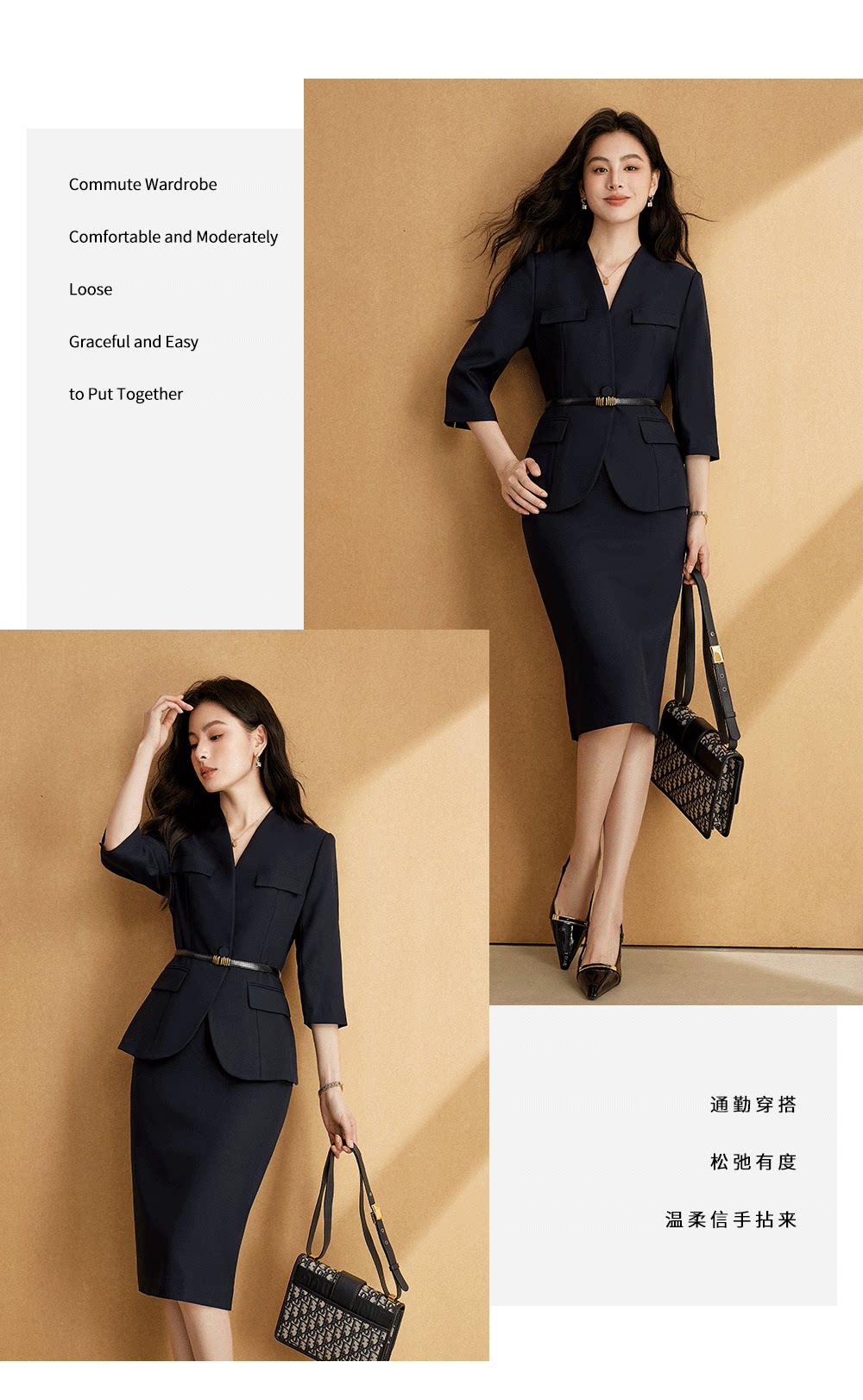 真正的职场高级感,从来都不是张扬的设计,而是藏在细节里的质感与品味。这款藏蓝色职业套装,用经典配色与利落剪裁,打造属于职场女性的高阶穿搭。