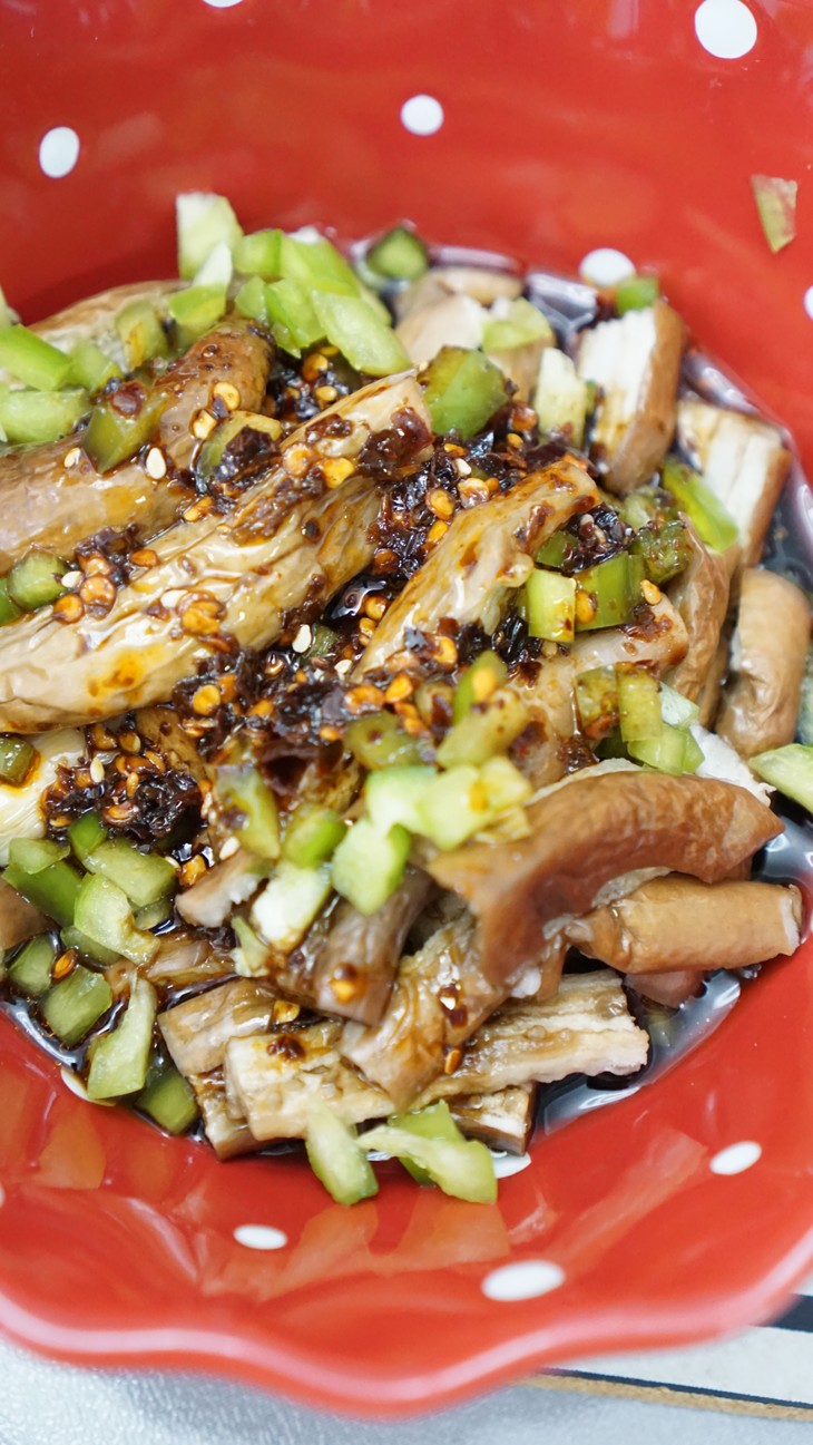 2、茄了洗净、切段,用盐水浸泡10分钟左右。青椒洗净、切丁备用。