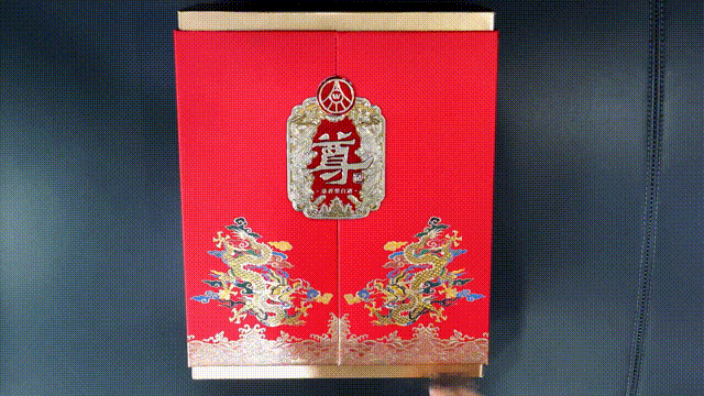 礼盒沿袭瓶身高贵色调,以贵气沉稳的黄、绛双子色为基调,龙盘踞祥云,跃然于上!