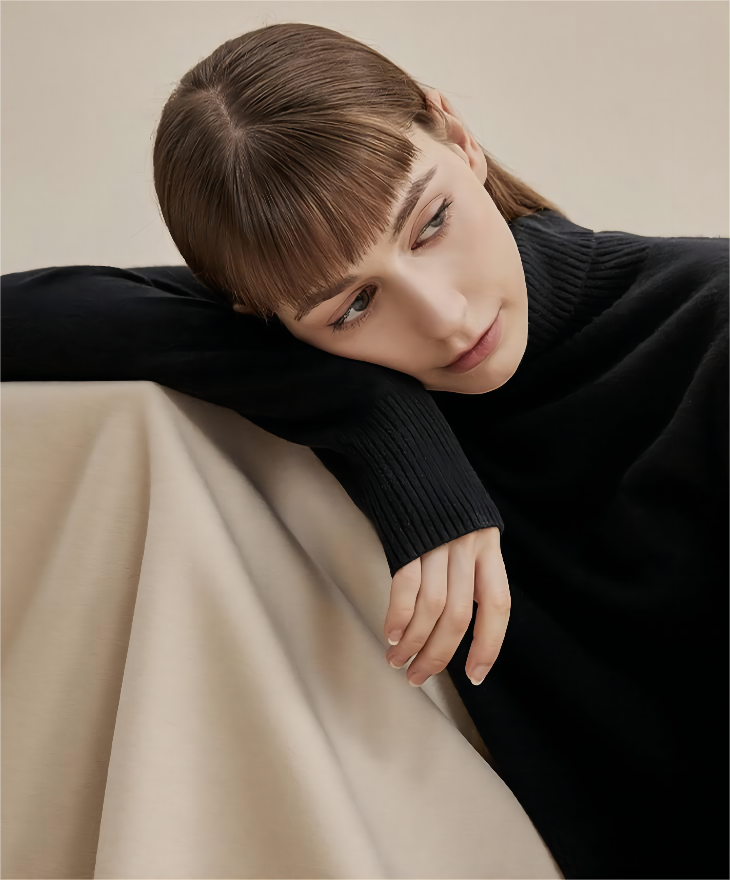 YANECINE设计研发团队在羊毛纤维表面附上一层由植物提取的超薄纳米级别透明保护膜,毛衣的光泽感更强,看起来更高级,手感软糯细腻。