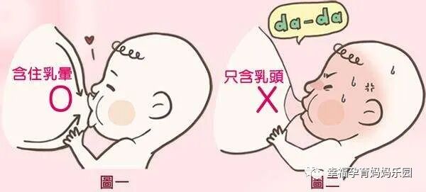 4、宝宝张大嘴含住乳头和大部分乳晕;