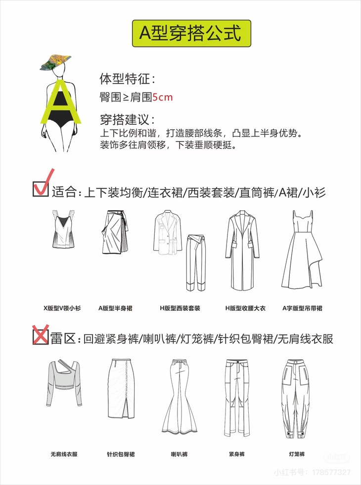 穿搭建议:收腰放摆,凸显腰身纤细优势。下半身装饰平衡回避高领、宽松等不显身材的单品搭配。