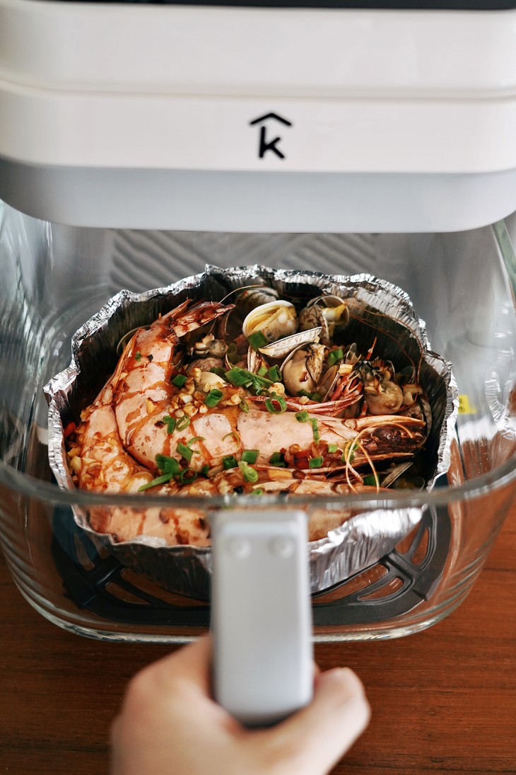 4.酱汁均匀撒在海鲜上用锡纸盖住,放入空气炸锅200C烤20分钟,掀开锡纸盖,再烤5分钟即可