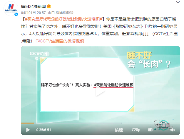 有研究发现睡眠不足比睡眠充足,让人更容易感觉吃不饱,导致摄入更多热量。还会使餐后血液中脂肪快速清除,给身体储存,进而导致体重增加。