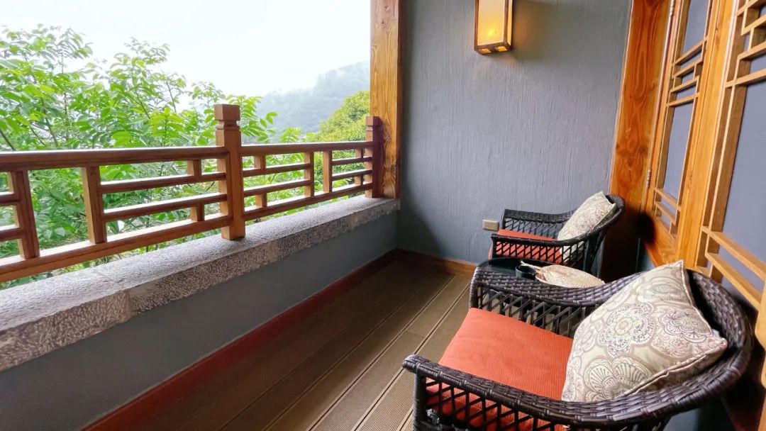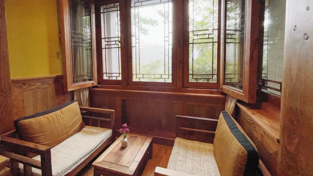 大堂的窗是一幅田园画,推开所见千年老树、层层叠叠的稻田、辛勤播种的村民还有远处的群山…想到秋收来临,金黄漫山,稻香扑面,很有“稻花香里说丰年”之感。