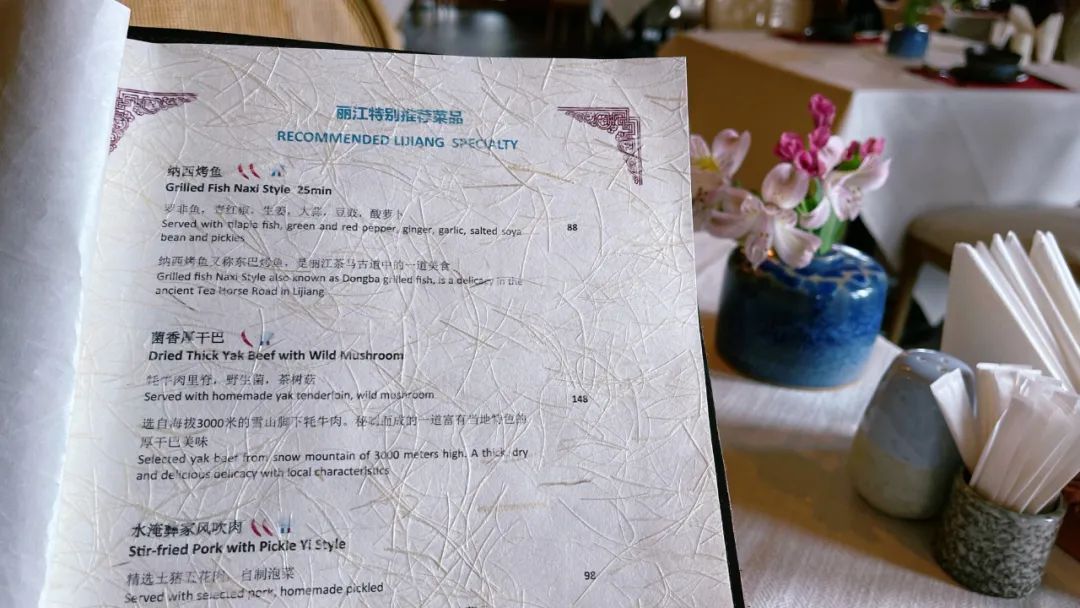 午晚餐是点餐制,整整一本随便挑选,无菜量限制,只要不浪费,管够,简直是大胃王的最爱!想体验当地口味的推荐纳西烤鱼、海棠小排,还有特色肋排骨火锅等着你。