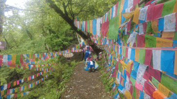 山野烂漫的塔城,十分适合深入山区探寻自然,在这里我们完成了此次旅行的第一次徒步!酒店对面的山顶上有当地人常去转经朝圣的达摩祖师洞。道上的巨型玛尼堆篆刻着般若经文,两边悬挂的风马旗保佑着每一位朝拜人。