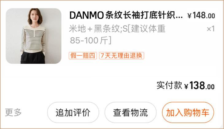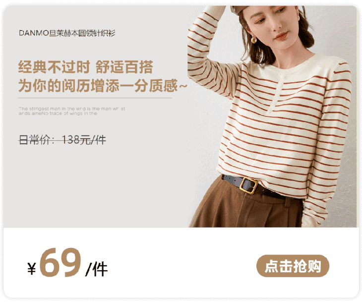 就好比DANMO这件条纹衫!市场价138/件,我们跟品牌方谈到福利价:只要¥69/件!!