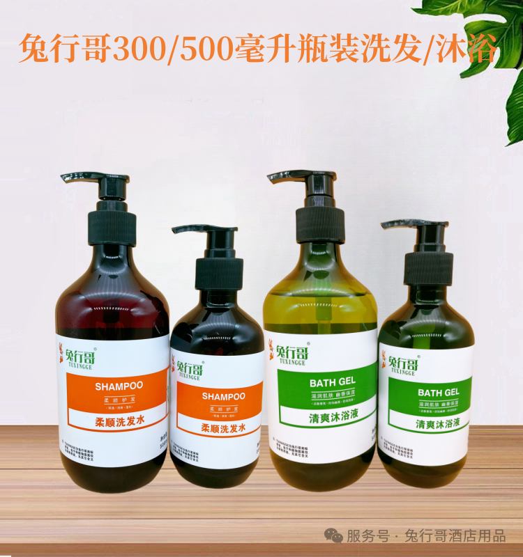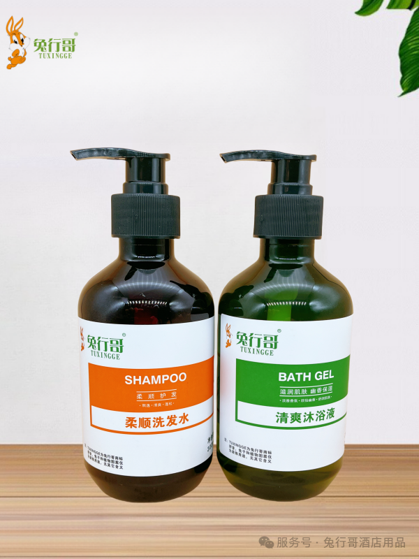 兔行哥彩色标贴的洗发水沐浴液是无色透明液体,采用天然草本白茶香型,洁净肌肤,滋润保湿,让您的客人沐浴在大自然中。