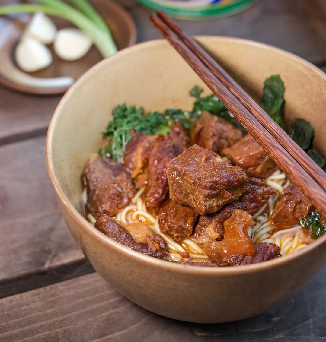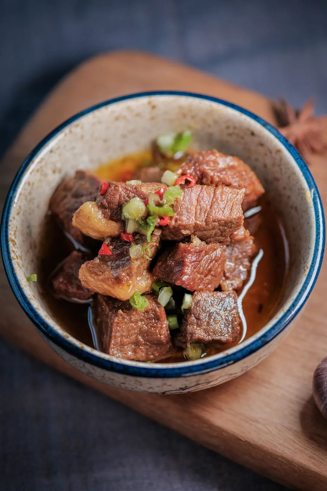选用放养牛肉,肉质有嚼劲,肌肉纤维均匀,肥瘦比例更适合。采用云南传统红烧技法烹制。