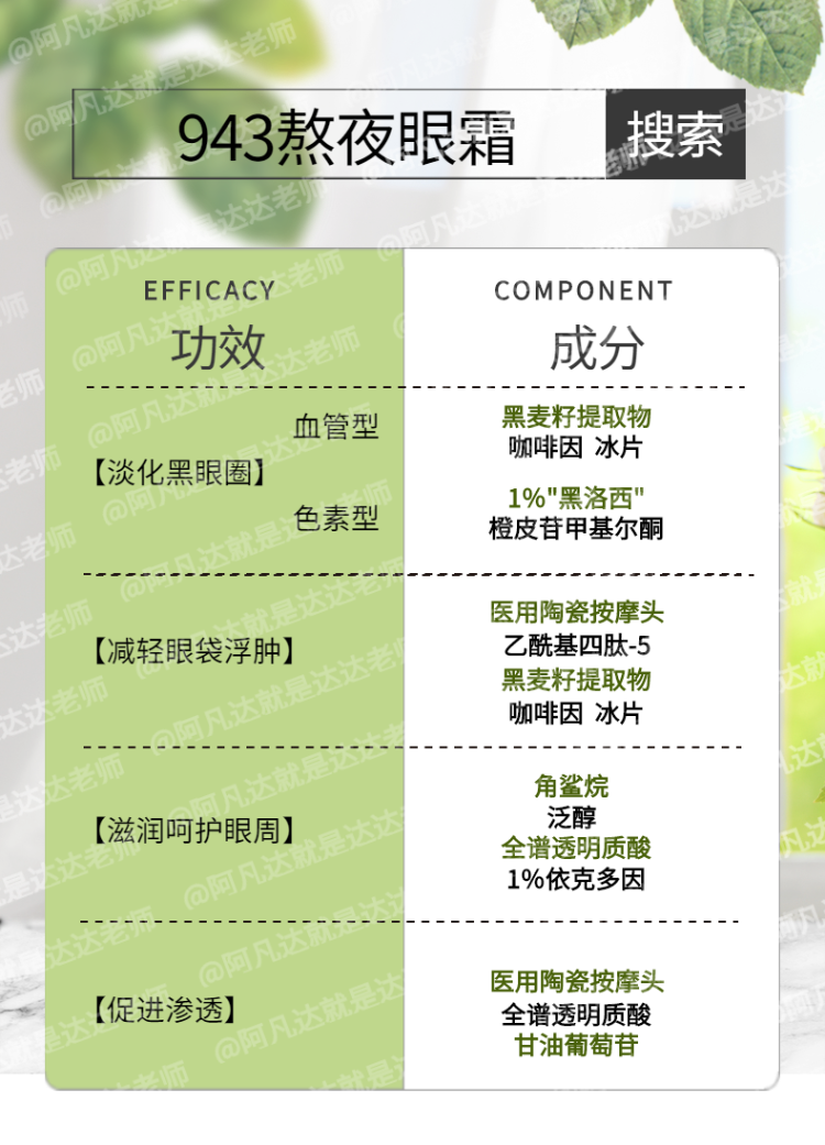 正所谓:请神容易送神难,吃了熬夜的爽,就要承受熬夜的shit, 接踵而来的黑眼圈啊,浮肿啊,这样的问题,想要用一个性价比高的针对性的眼霜,943这款还真的可以说道说道。