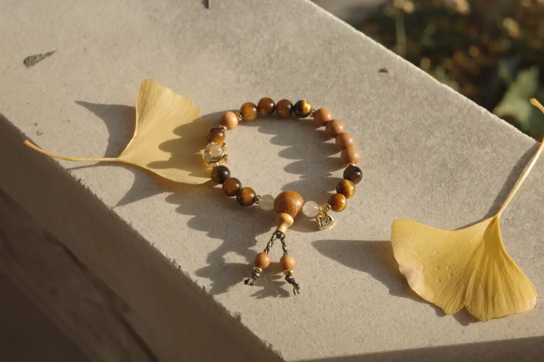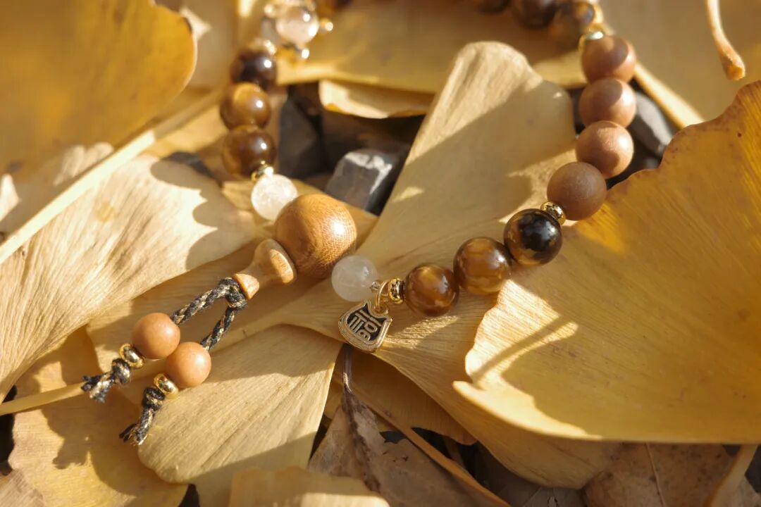 马蹄投影石映护佑、聚能虎眼石增决断、檀香珠稳气场、金发晶招财运。
