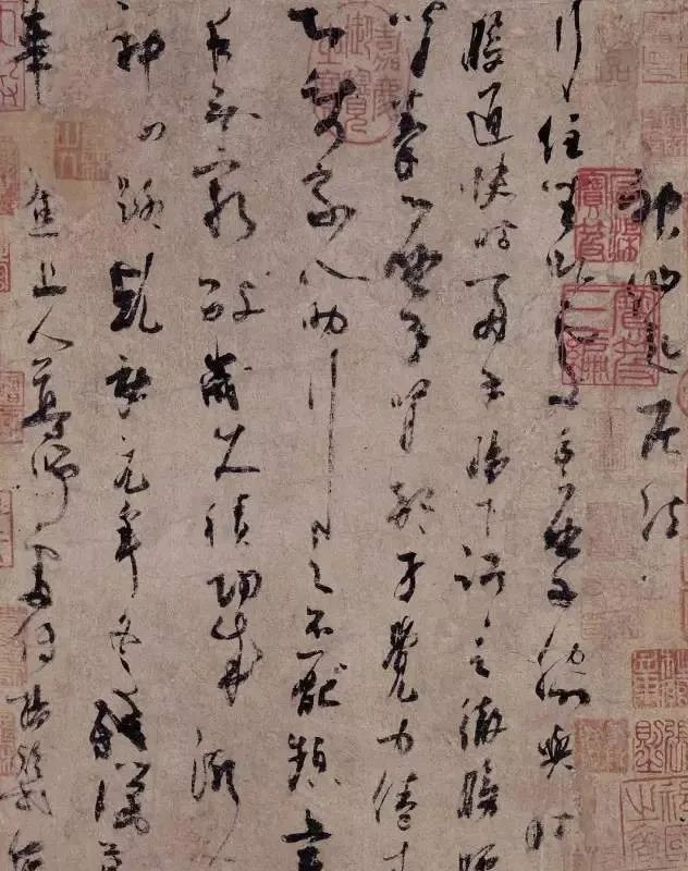 如果想写一封十几个字的信札,加多少水研几下墨基本上都恰到好处,自然也有大意的时候,自然也有突发状况。如果没有用完,过去墨很值钱,舍不得浪费,就加一些可有可无的落款之类,如果不够用,就挤一挤笔或者加点水凑合着写完,于是乎,墨法枯湿浓淡就出来了。每蘸一次墨大约写十几个字不等,这十几个字就自然而然的形成一个从浓湿到枯淡的墨段,一次完整的研墨就是包含几个墨段的章节,在视觉上就好比一篇小型的八股文。颜鲁公的祭侄文稿就是一个很好的例子。