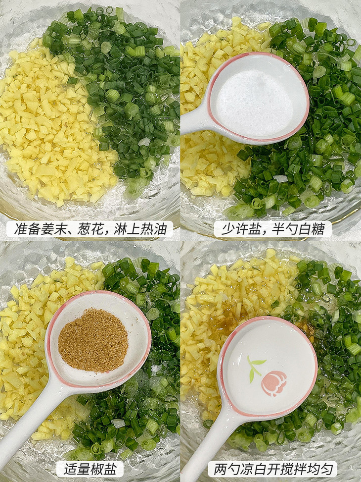 2、将切好的姜末、葱花放入碗中,淋上热油,放入盐、白糖、椒盐和适量凉白开搅拌均匀。