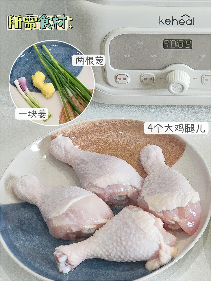 3、鸡腿放上蒸盘,放上姜片,选择“速蒸”模式蒸30分钟