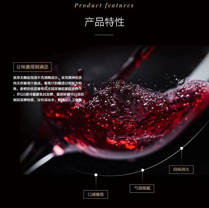 美思庄园紅葡萄无醇起泡酒采用古老且源自于希腊的品种莫斯卡托酿制,再采用特殊技术来抑制酒精发酵达到完全零酒精的特点,适合所有人饮用。