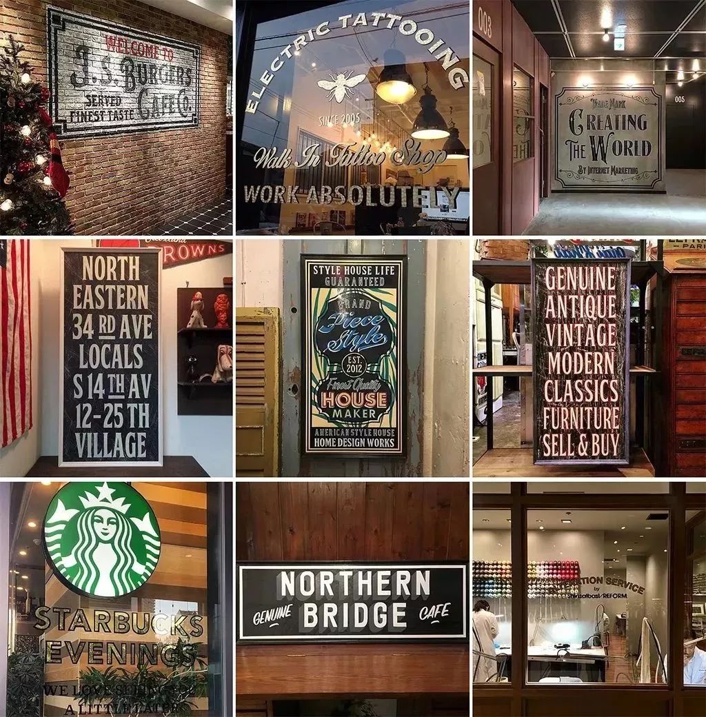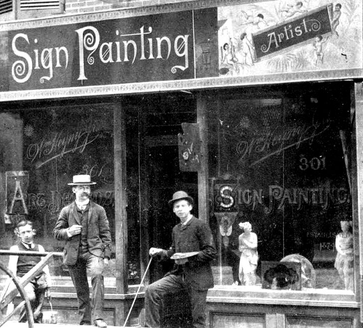 在19世纪60年代,几乎所有的招牌都是所谓的招牌绘写师(Sign Painter)来绘写的,那是美国手写招牌的黄金年代,遍地的招牌制作商店(Sign Shop),职人可以接到大量工作,有非常多的就业机会。那时候美国的广告业没有那么发达,对于普通商户来说,请一位招牌绘写师,版面设计、字体设计、插图、材料制作一条龙全包了,既有效率又经济划算。
