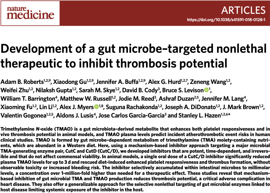这样就可以开发能够导致CutC/D永久失活的强效抑制剂。比如2018年美国克利夫兰医学中心的一项新药,专门以抑制关键酶CutC/D作为药物的核心功效【8】。