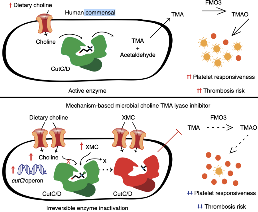 通过给小鼠使用这种新型的XMC(IMC和FMC)抑制剂,科学家们发现能够显著降低血液中TMAO的含量,另外血栓的风险也大幅下降。这种方法直达病灶,简单有效,且命中率高。