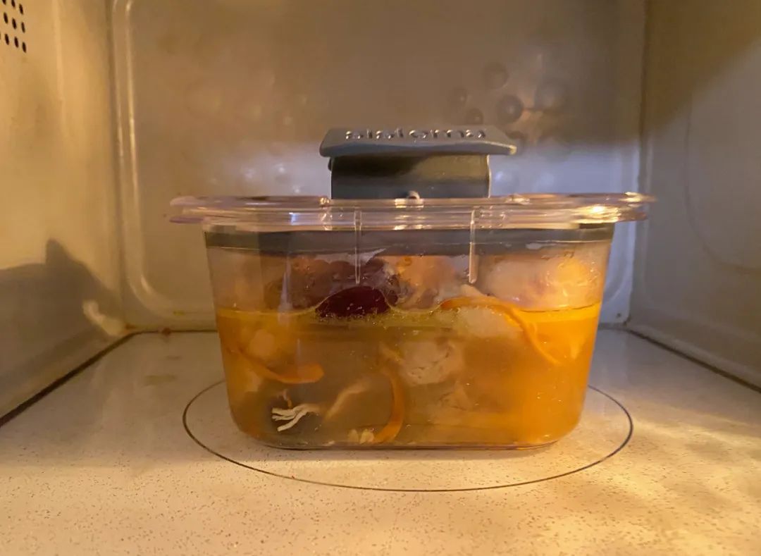 它家这个排气孔的另一个妙用就派上用场了:整个保鲜盒都可以放进微波炉加热,打开小翅膀让它放气就行。(特别要提醒的是,它只能进微波炉✅,不能扔进温度过高的烤箱❎和空气炸锅❎)
