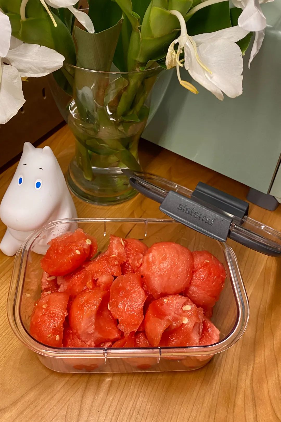 夏日必需品西瓜也是。我现在战斗力下降,一次炫不完个大的甘美瓜了,挖出来放盒里保鲜,第二天还能继续享受冰凉凉的甜美。