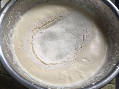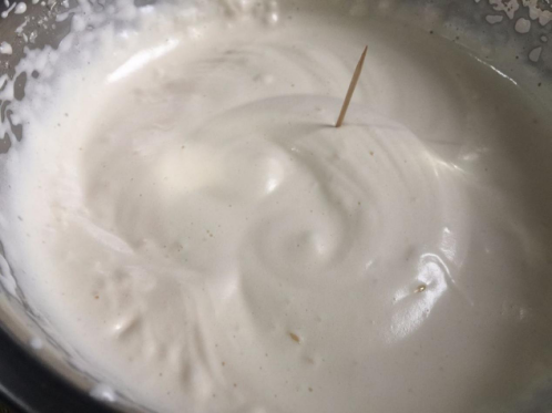 3、加温融化黄油与牛奶一起倒进来,倒的时候轻缓一点,翻拌的手法既要轻而且还要迅速
