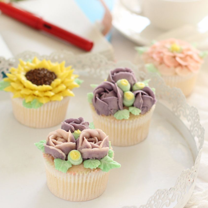 7、调好颜色的豆沙装裱花袋,用适合的裱花嘴裱出各种样式的花朵;图中这个是104号裱花嘴,逐层裱完花瓣之后,再用一号花嘴点缀花蕊,这样就完成啦!