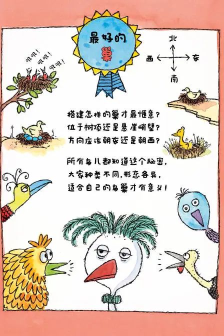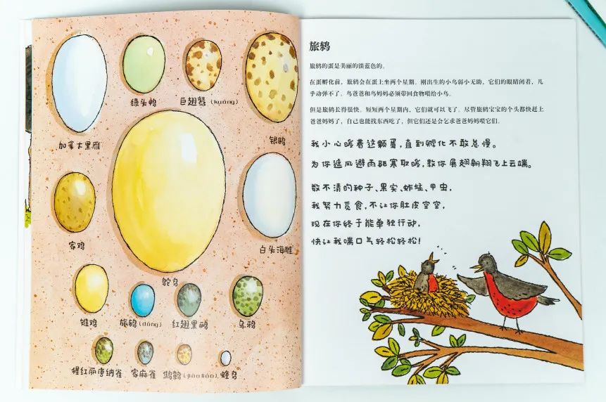 比如说蜂鸟的蛋只有蓝莓那么大,驼鸟的蛋和柚子差不多大,孩子看了就明白,鸟儿的个头、种类不同,生的蛋大小、形状也就不同。